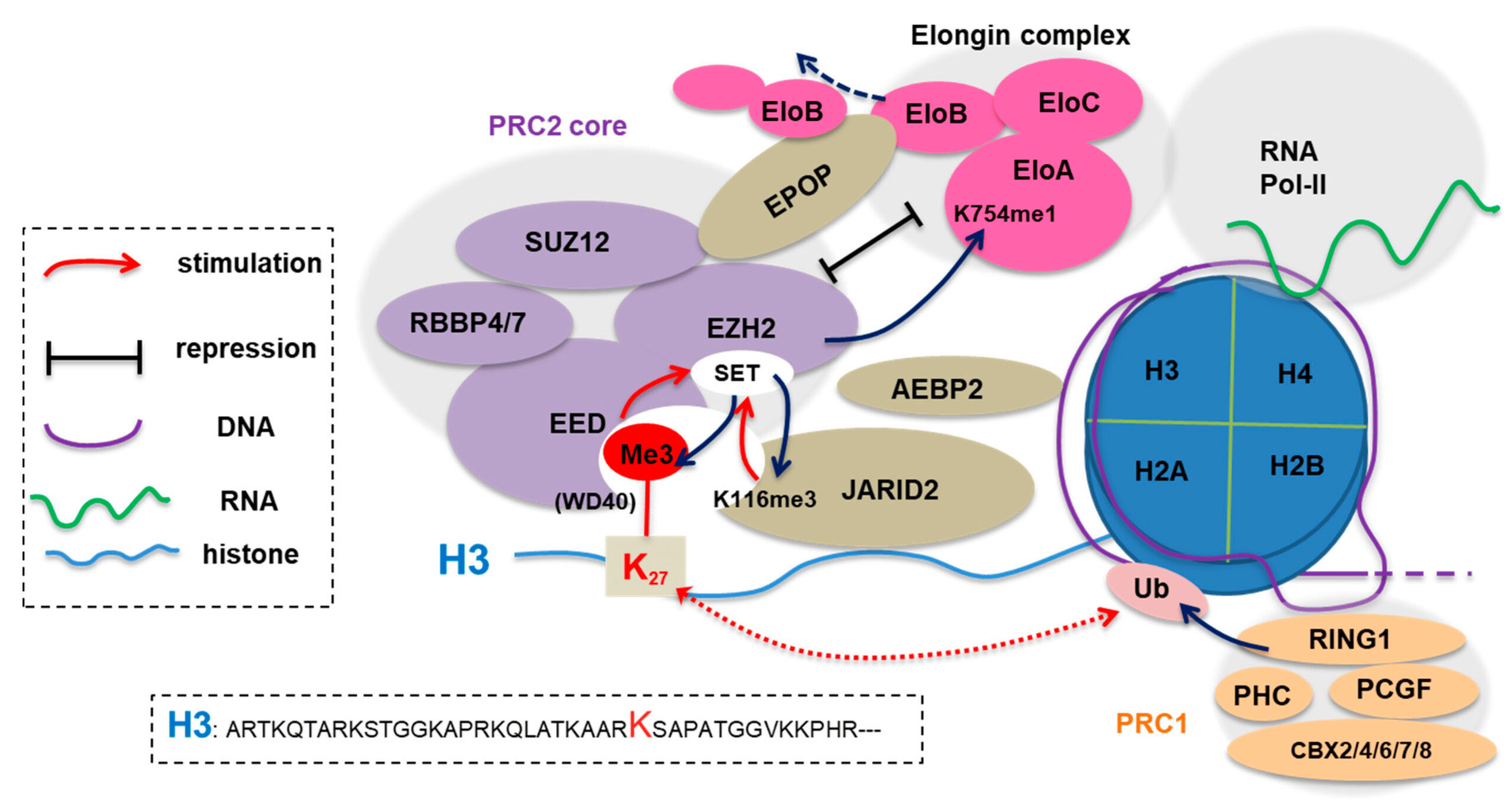 Histone post-translational modifications (PTMs) mainly contain methylation, acetylation, ubiquitination and phosphorylation. Disturbance of the histone code contributes to cancer initiation, progression and metastasis. For cancer metastasis, epithelial-to-mesenchymal transition (EMT) transcription factors can recruit histone-modifying complexes to chromatin in order to induce epigenetic silencing [10,11]. Enhancer of zest homolog 2 (EZH2) is the enzymatic subunit of PRC2, which can trimethylate histone H3 lysine 27 (H3K27me3) and mediate transcriptional silencing.
