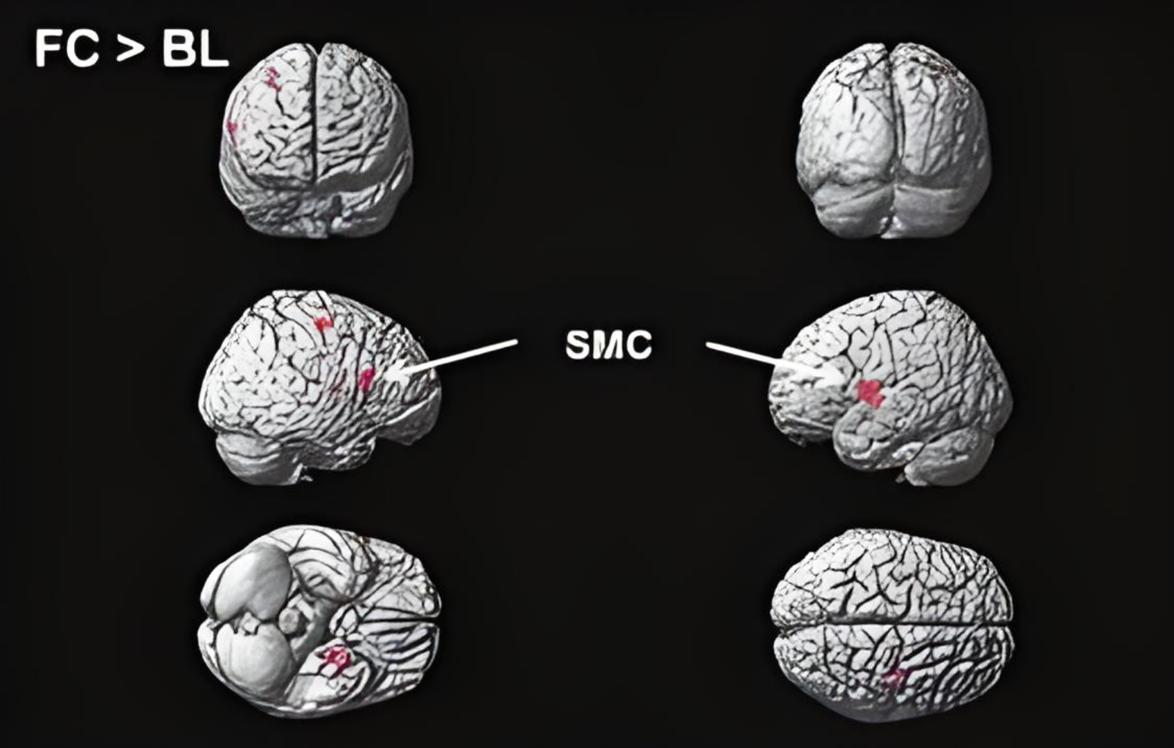 Figure 3: MRI of the brain whilst clenching, shows the parts of the brain used. This image shows statistical maps projected onto a standard brain template. The maps compare brain activity during different tasks: (A) Fist clenching compared to baseline (rest). (B) Teeth clenching compared to baseline. (C) Teeth clenching compared to fist clenching. The areas labelled are DLPFC (dorsolateral prefrontal cortex), PPC (posterior parietal cortex), SMA (supplementary motor area), and SMC (sensorimotor cortex). The statistical threshold used is P < 0.005, meaning only significant results are shown without correction for multiple comparisons. Image adapted from: tandlaegebladet